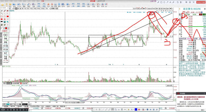 所以通富微电这是短期的走势,目前来说相对还是比较强势的,二六点六这个位置目前来看是站稳了,站稳之后需要放量上攻去攻击三十二块五这个位置,让我们拭目以待。